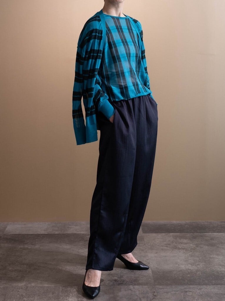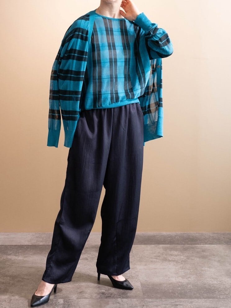 同柄同素材のクルーネックニットをご用意しているので、アンサンブルとして