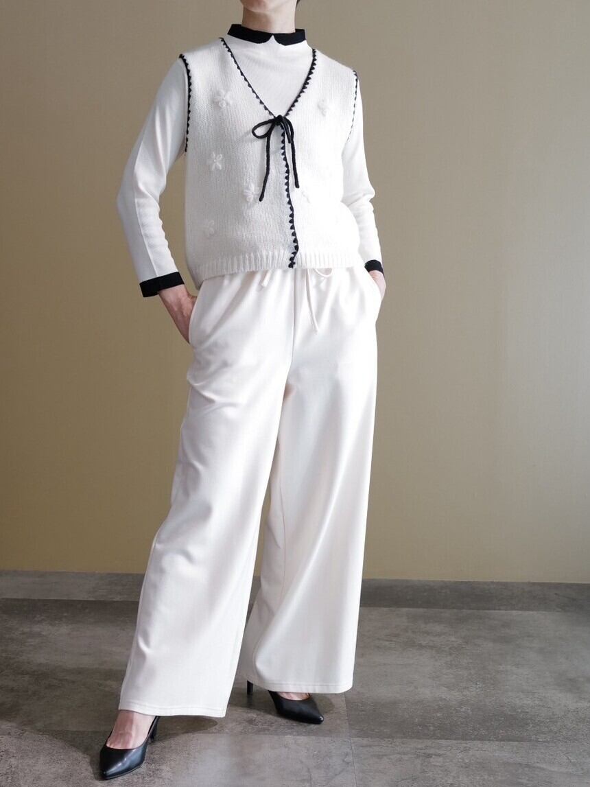 やや短めのシルエットなので、ボトムス選びもパンツ、スカート