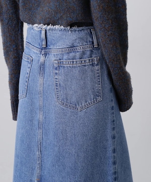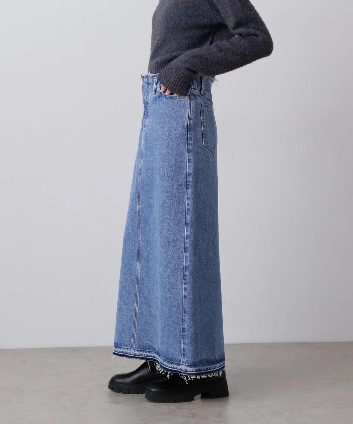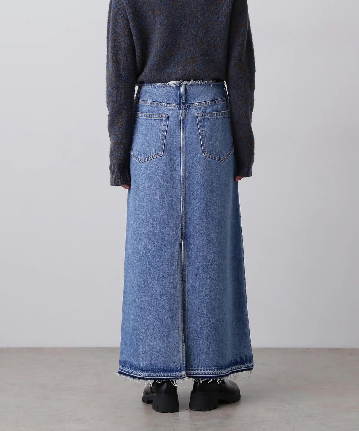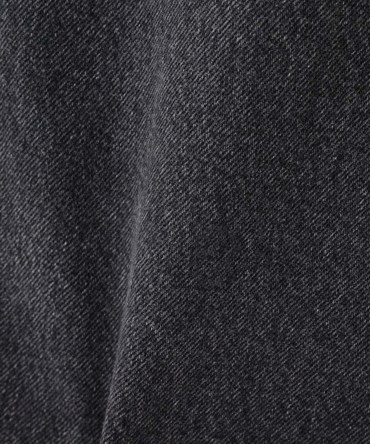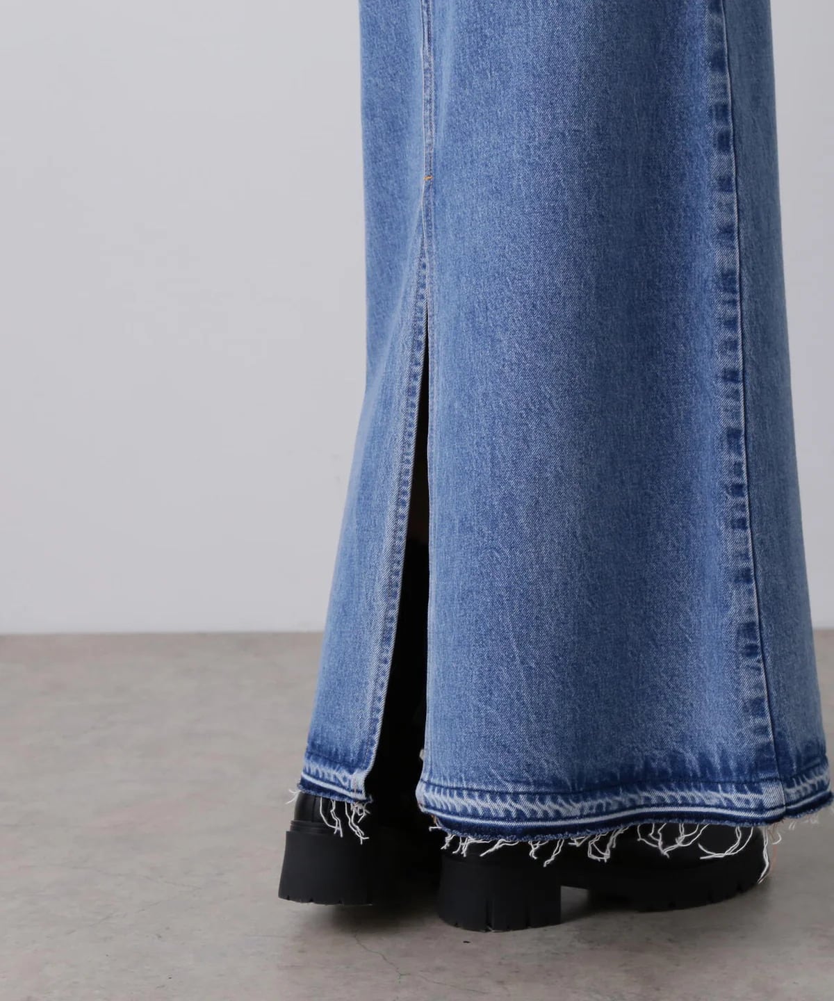 オリジナルの13.5ozデニムは、旧力織機で織られた白耳のセルビッチデニム。隠しリベットや渡り閂、環縫いなど本格的なデニム仕様。フェイド加工は職人の手によって1本ずつ加工を施されたこだわりの加工です。加工している為生地の特性上斜行があります。#020は経糸、横糸ともに硫化ブラックで染め、製品洗い加工の負担を低減した新しい技術を採用。#110は、水を40%、化学薬品を50%削減したサスティナブルな染色。ローウェストのロングスカート、ウェストと裾は断ち切りです。