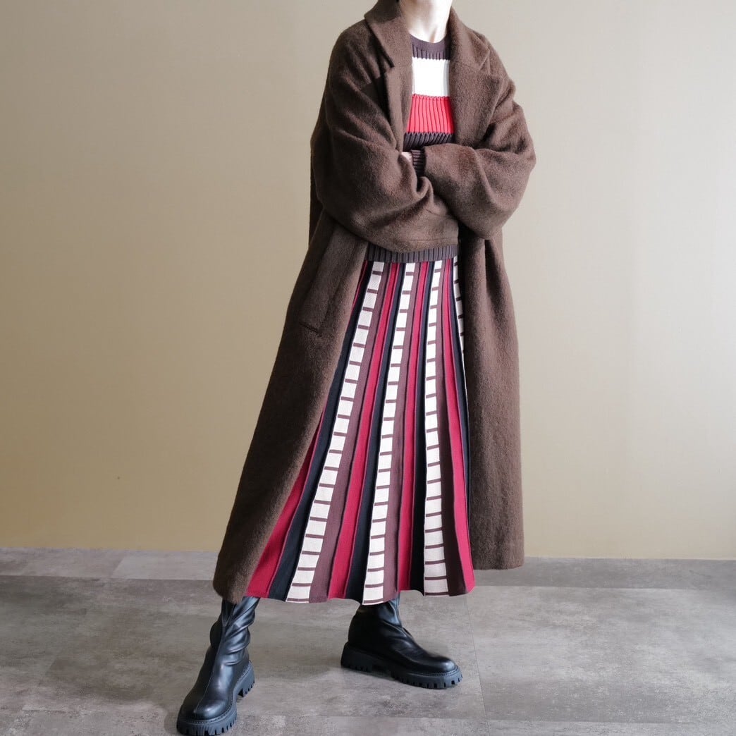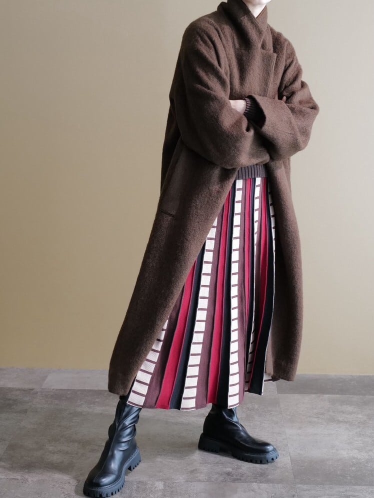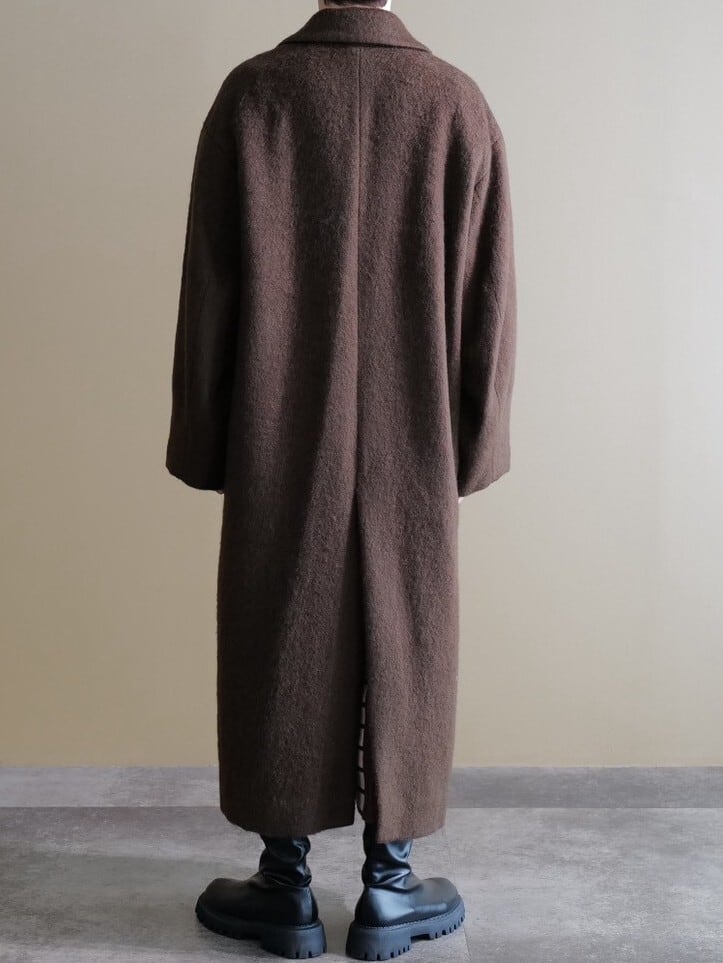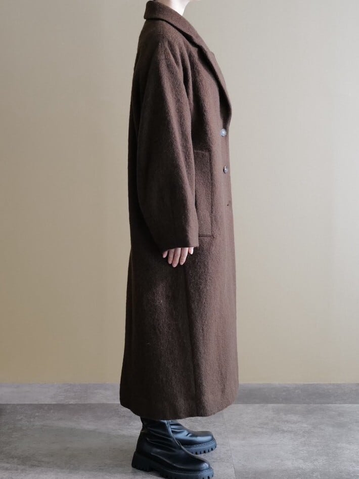 軽くて暖かい毛足の長いウール混シャギー素材を用いたロングコートです。