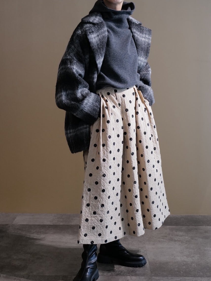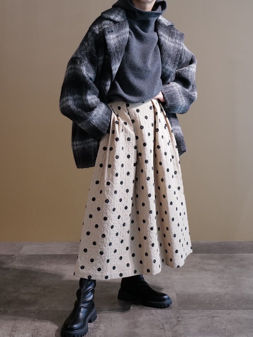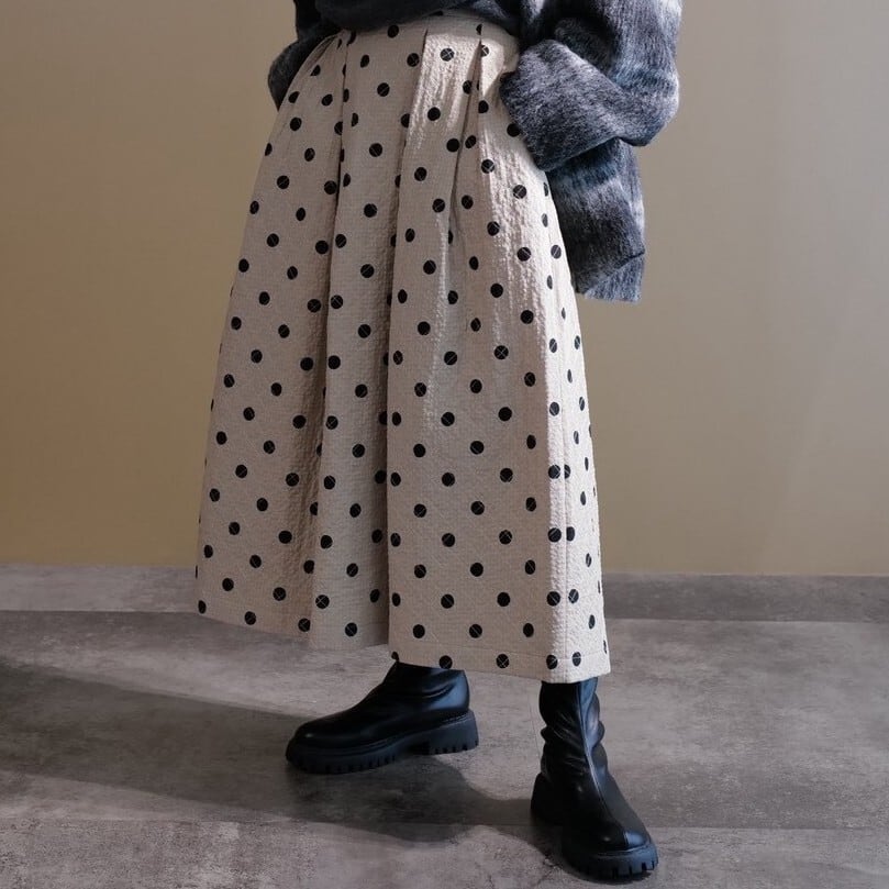 ベージュ色にDOT柄が散りばめられた可愛らしいフレアスカートです。