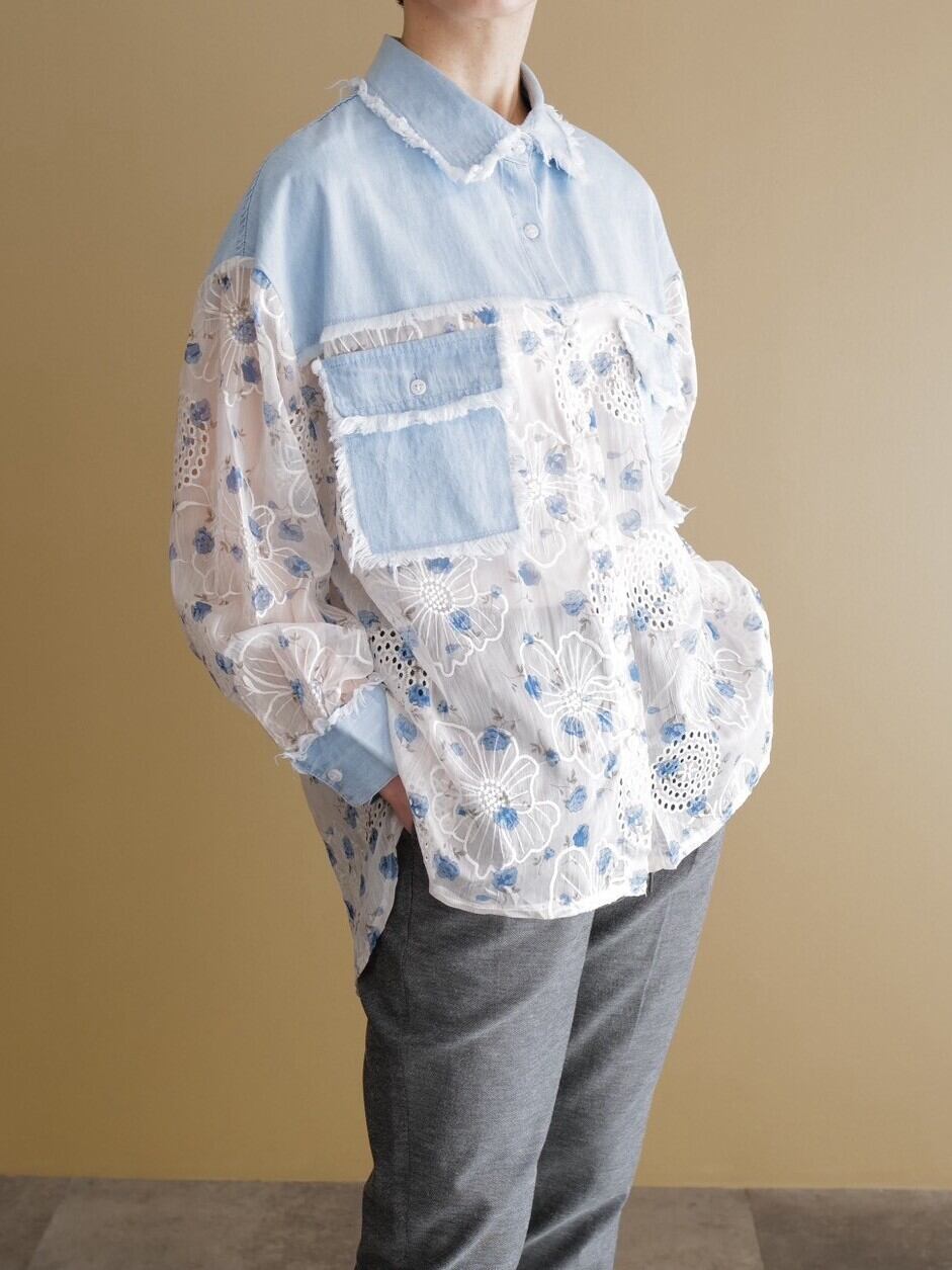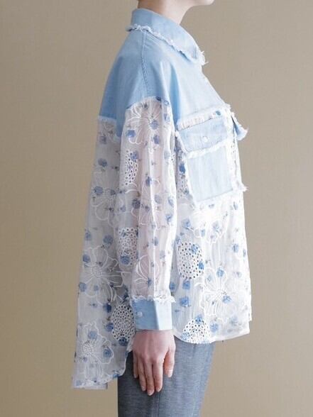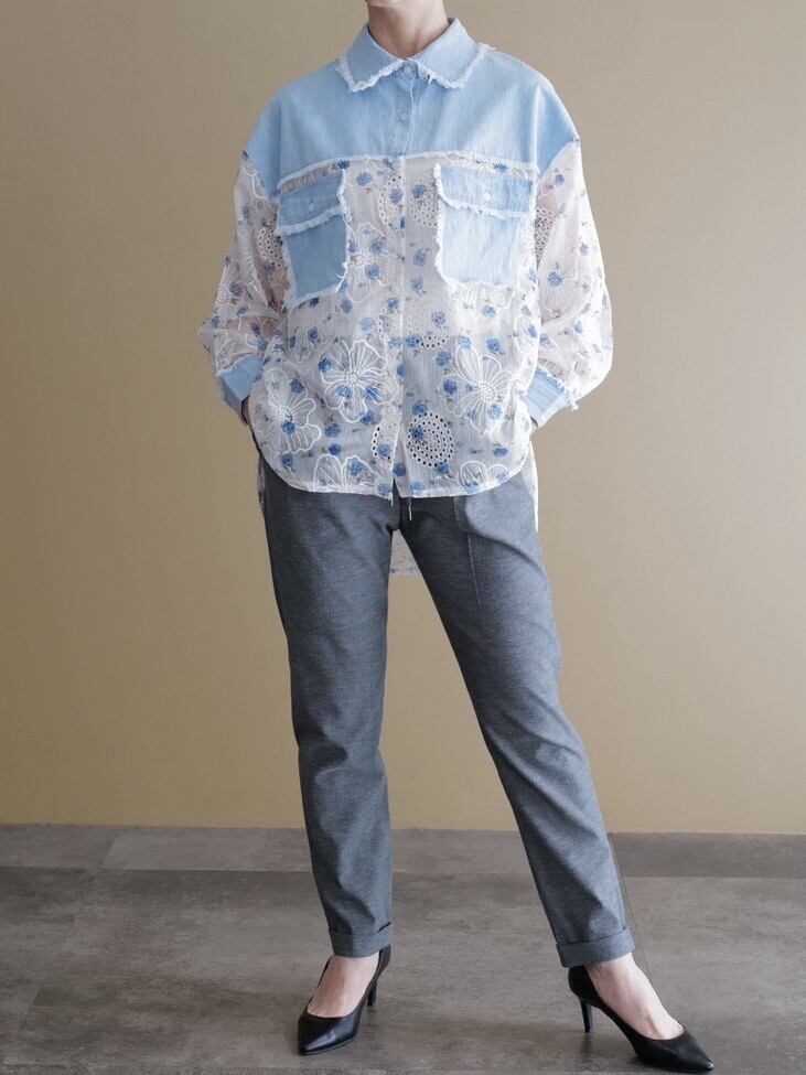 シア感のある生地が特徴な薄いデニム生地とのコンビブラウスです。