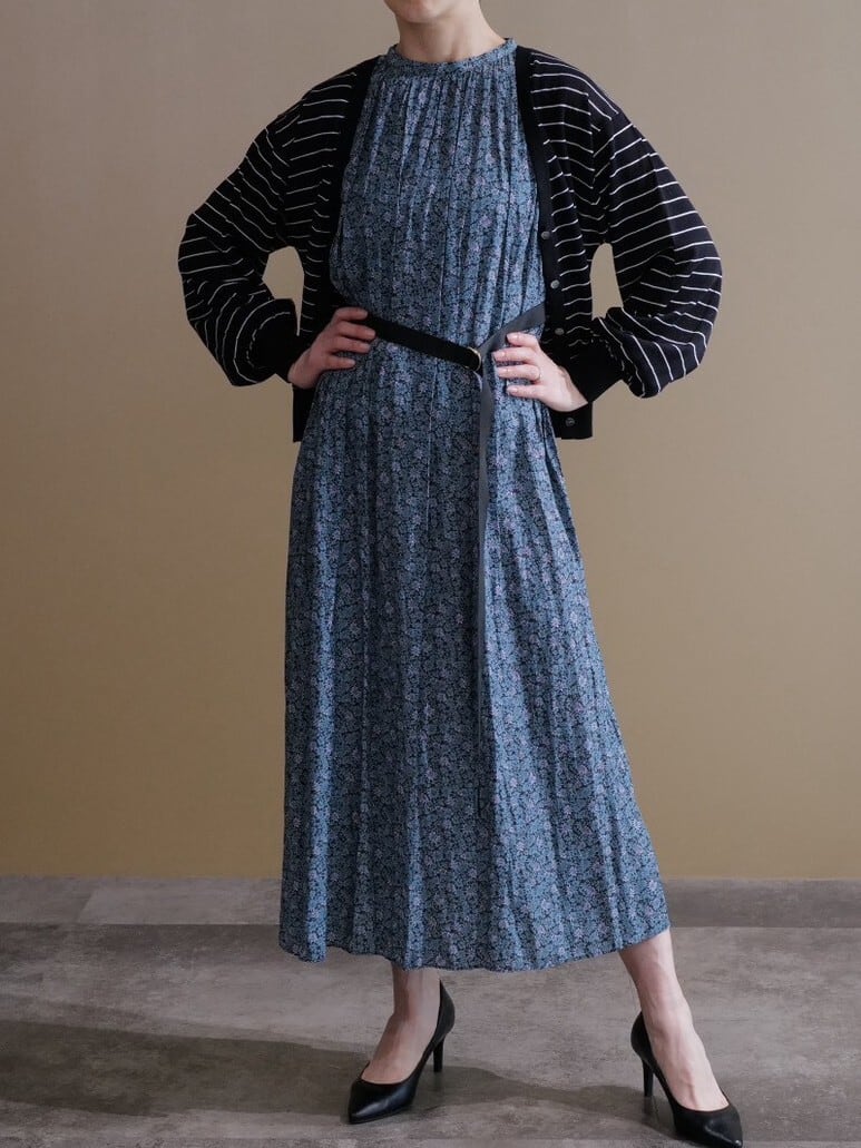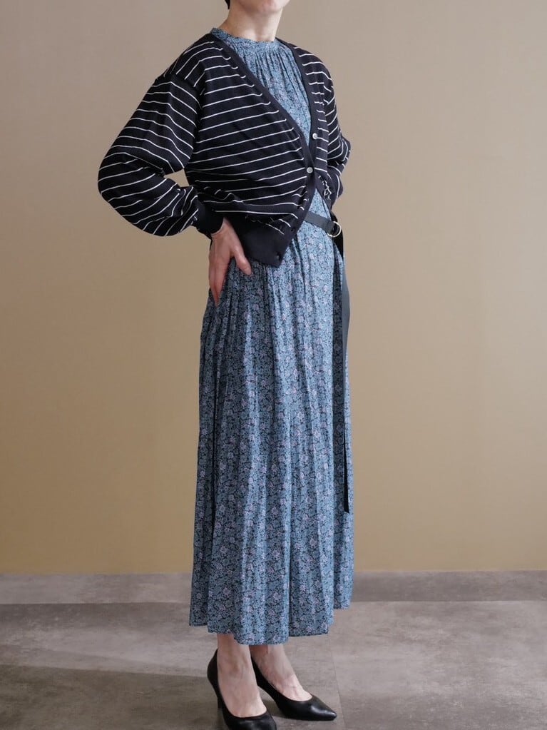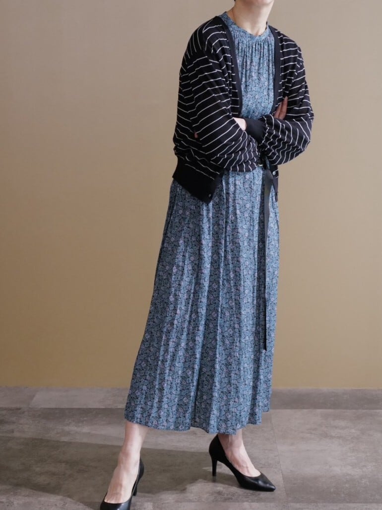 程よく肩回りが隠れる小花柄がアクセントになるワンピースです。